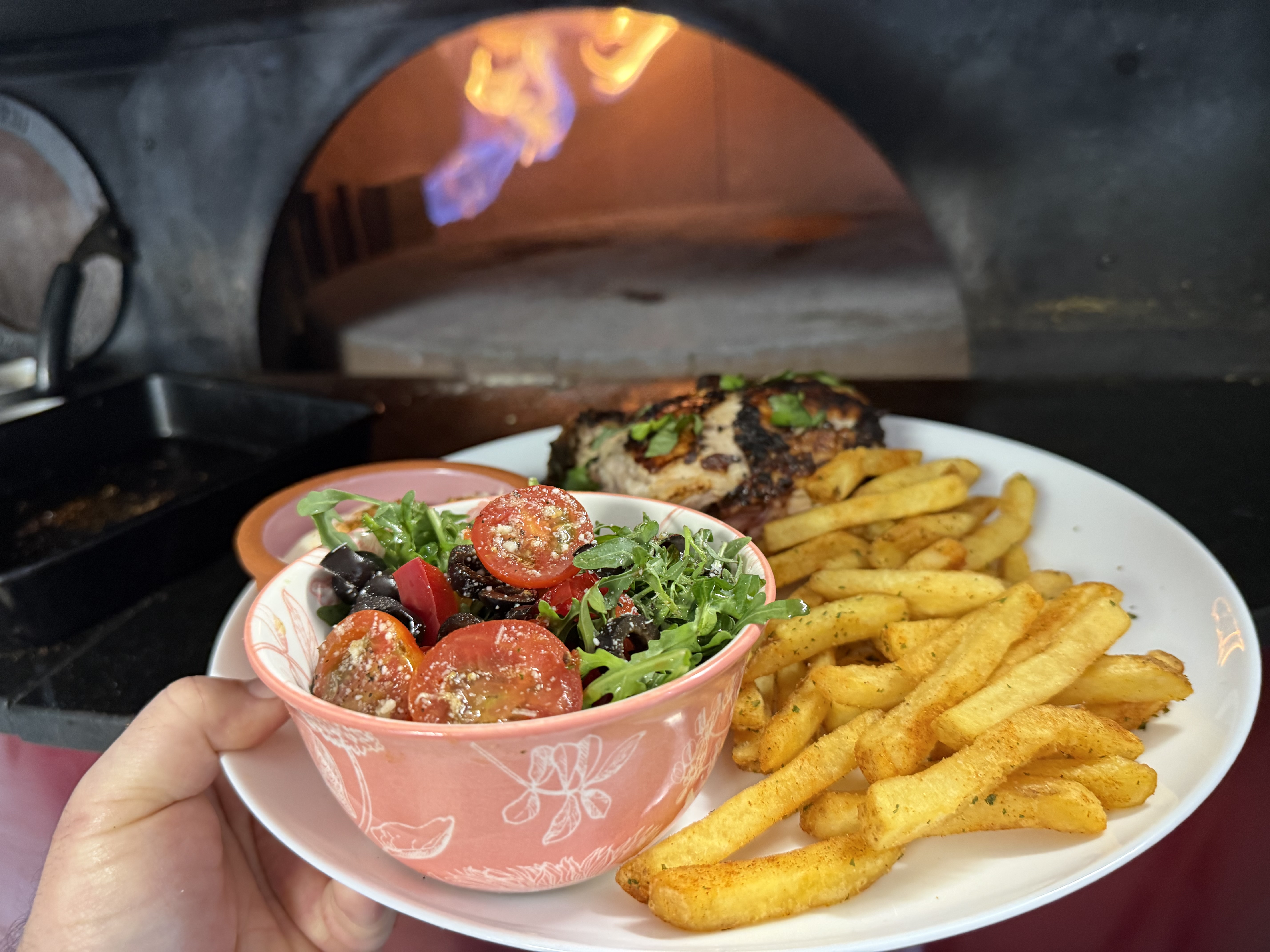 Then, instead of a standard grill, we do something different — we cook every piece in a traditional wood-fired pizza oven. The result? Impossibly juicy chicken with a smoky char you simply can't replicate.